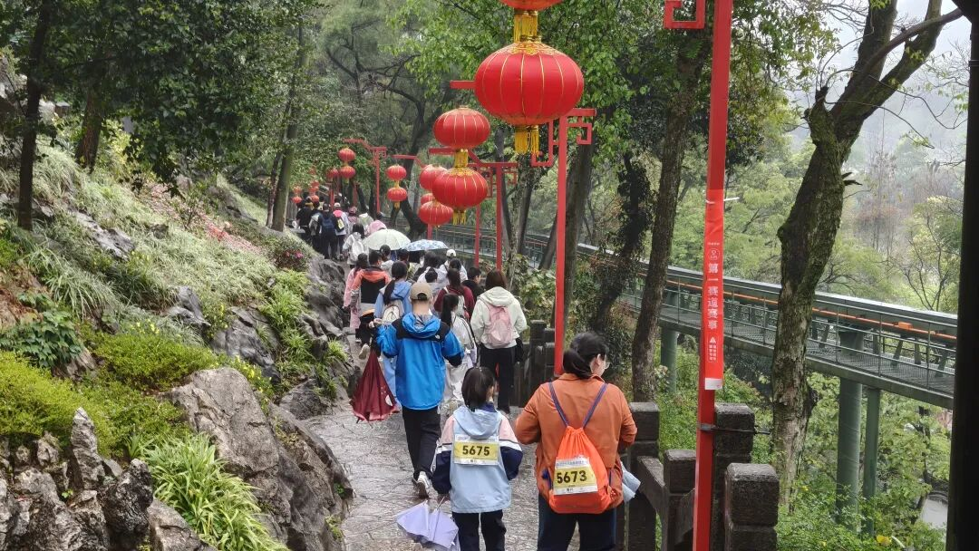 尽管春雨绵绵,但漫山遍野的野生山樱正值盛花期,粉白花瓣在雨雾中层层叠叠,与远处苍翠峰林形成“叠翠”之景,令不少徒步者冒雨拍照留念。