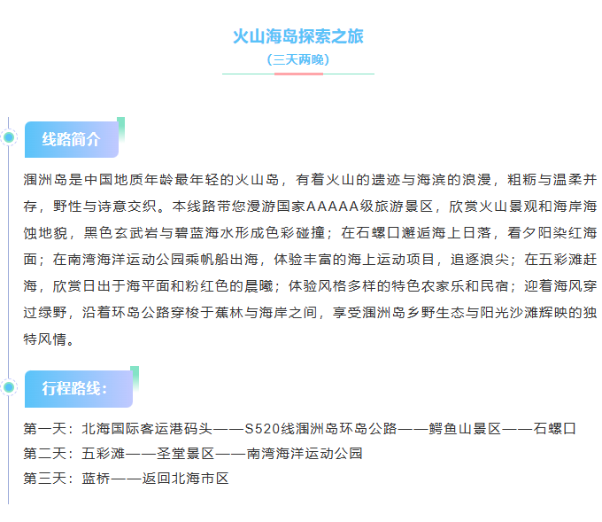 S520线涠洲岛环岛公路是广西唯一一条环线省道,将涠洲岛的多个旅游景点串联起来,是岛上最重要的主干道之一。环绕整个岛屿,沿途经过多个著名旅游景点,正如其名字520的谐音“我爱你”,这条省道也被许多人称为“爱情公路”。沿着S520线骑行,一路尽是自然美景与浪漫情怀。