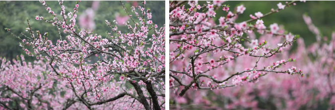 近年来,海洋乡依托生态资源优势,以花为媒,大力发展乡村旅游,将“桃花经济”与乡村振兴深度融合,推动农文旅产业协同发展。目前全乡桃子总种植面积达2.3万亩,年产量1.8万吨,涵盖曙光油桃、春美蜜桃、毛桃、锦绣黄桃、鹰嘴桃等品种,已成为桂北地区最大的桃产业基地。如今,海洋乡的桃花不仅成为当地亮丽的春日名片,更带动了周边农家乐、农产品销售等业态升温,让“赏花经济”真正成为助农增收的“致富花”。