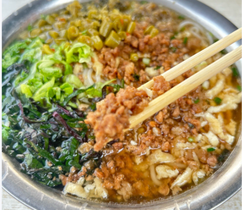 生榨米粉,由米浆发酵后压榨而来的,软滑香馊,带有些许酸味。煮熟的榨粉配上爽脆的生菜、酸菜、紫苏和葱花,再加上一勺嫩滑碎肉,吃上一口令人回味无穷。