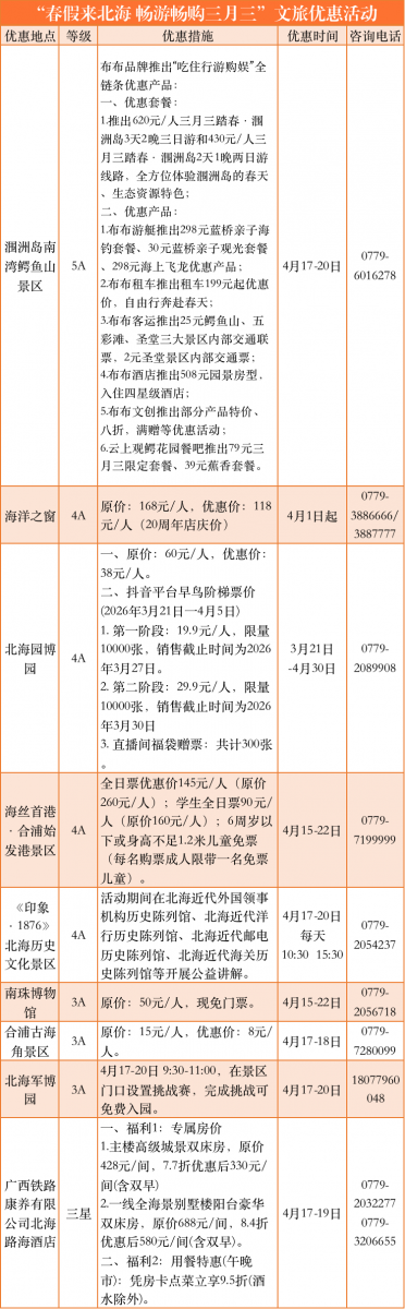 涠洲岛鳄鱼山景区推出吃住行游购娱全链条优惠(低价海景房、亲子海钓套餐);海丝首港、海洋之窗、园博园等4A景区门票直降;南珠博物馆免费开放;路海酒店享专属折扣,出游成本大大降低。