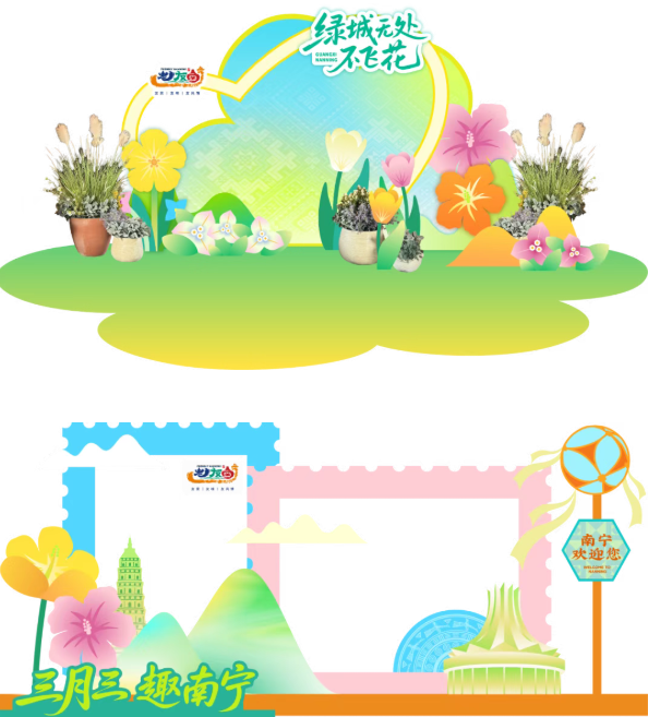 “绿城无处不飞花”的打卡装置,将南宁的春意具象呈现。这里设置了“三月三 趣南宁”“绿城无处不飞花”“水果自由”三大主题打卡装置,繁花从墙头倾泻,绿意在小径蔓延,仿佛一脚踏进了邕城的春天,稳稳拿捏春日氛围感~