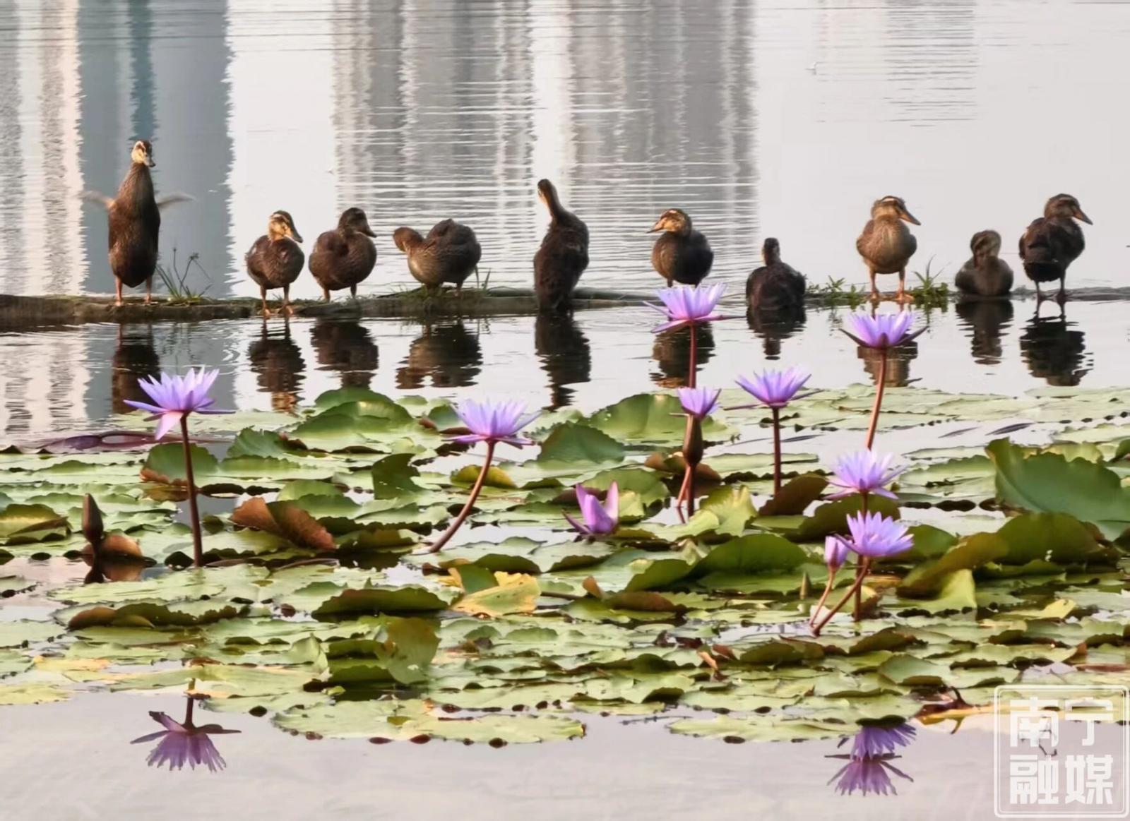 4月10日,记者来到南湖公园清莲湾,步入五曲桥,远远望去,只见粉色、紫色、黄色等花儿在碧水中尽情舒展,在绿叶的点缀下更显灵动。最有趣的是,在这里不仅可以欣赏到睡莲绽放的风姿,还可以观赏到野鸭等水鸟游憩莲间的可爱场景,勾勒出一幅美好的湖面景致。