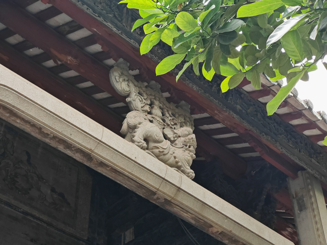 屋脊之下,梁架之间,尽展岭南木雕的绝妙技艺。工艺繁复精美,多取材于《金殿逼婚》《九焰山》《界牌关》《八仙祝寿》等戏剧故事,刀笔之间,情节流转,值得细细品味。