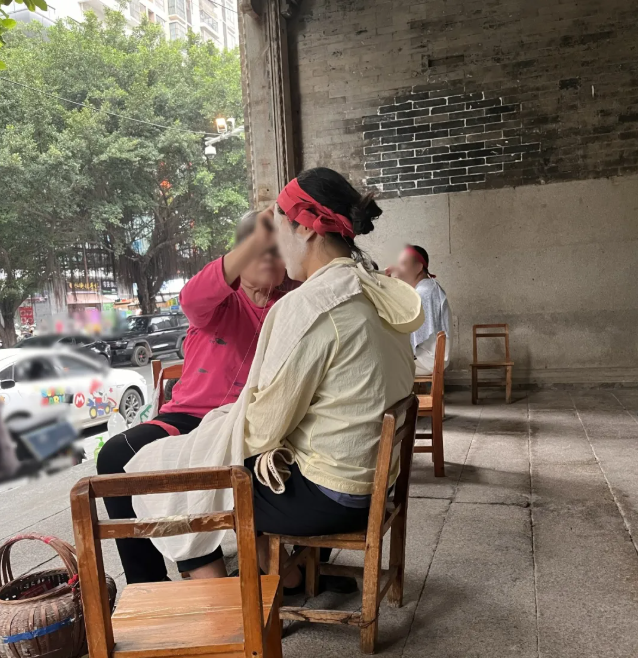 一位阿婆家住附近,常拎着小凳子,坐在粤东会馆的门楼前,为来往客人绞面。