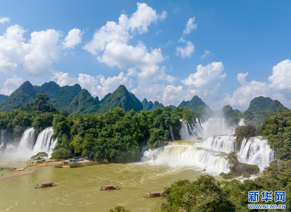 在广西崇左市大新县中越德天(板约)瀑布跨境旅游合作区,游人乘坐竹筏游览(无人机照片)。新华社发(龙涛摄)