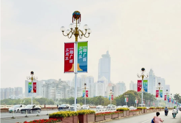 自4月14日启动的全市社会氛围营造工作已全面完成。漫步南宁,浓烈的节日气息扑面而来。民族大道、铜鼓岭路等城市动脉两侧,印有“三月三 趣广西”的POP旗迎风招展,宛如流动的彩色脉络。从吴圩国际机场、南宁东站等城市窗口,到繁华商圈、公园景区,无数LED屏幕同步跃动着“数智新体验,趣游三月三”“AI上南宁,趣游绿城”等宣传画面,生动诠释传统节日与数字时代的智慧交融。