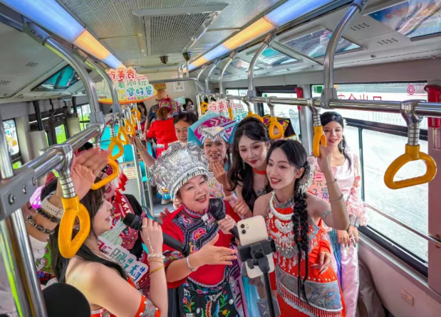 今年“三月三”的亮点在于科技与民俗的深度融合。开幕式上,“AI岛”在民歌湖上惊艳亮相,将人工智能赋能千行百业变为可触可玩的沉浸式体验空间。两辆“民歌巴士”开启双线直播PK——新民歌巴士从爱琴海城市广场出发,传统民歌巴士从三街两巷启程,沿民族大道一路走一路唱,途经民族广场、航洋城、万象城等城市地标,歌声随车流动,营造“出门即赶圩、上车即欢歌”的沉浸式节庆氛围。