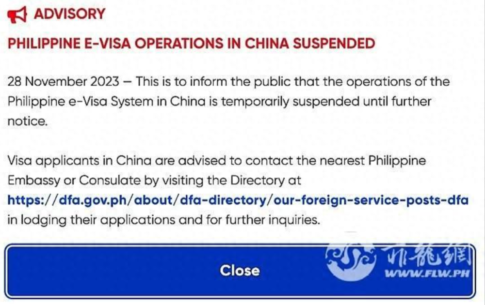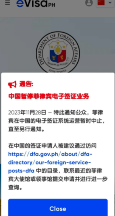 根据菲龙网此前报道,11月28日晚间,菲律宾政府电子签证系统平台 (evisa.gov.ph) 就已发布公告,称将暂停中国公民赴菲电子签证措施,直至另行通知。