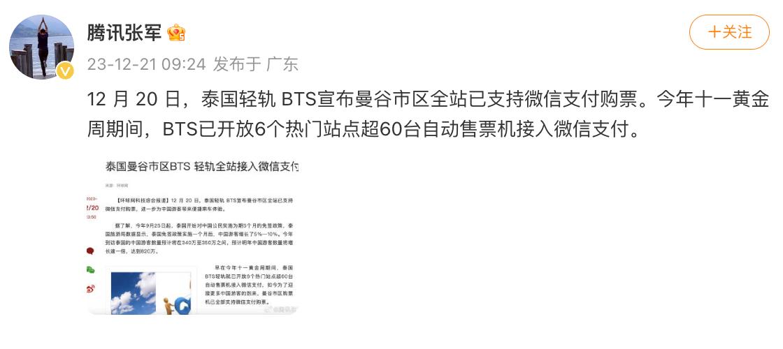 12月21日,腾讯公司公关总监张军发文称:“12月20日,泰国轻轨BTS宣布曼谷市区全站已支持微信支付购票。今年十一黄金周期间,BTS已开放6个热门站点超60台自动售票机接入微信支付。 ”