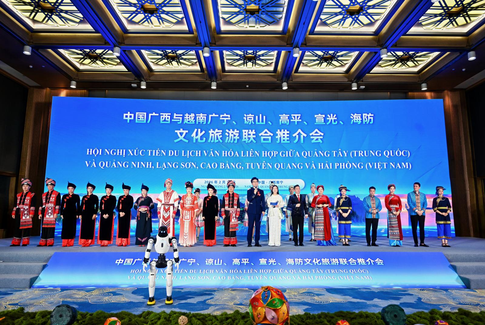 中国广西与越南广宁、谅山、高平、宣光、海防五省市文化旅游联合推介会则融合了AI机器人表演、中越天琴合奏等演出节目,涵盖桂越联合推介、京粤联合推介等环节,内容丰富精彩。