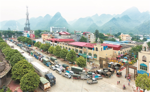 龙州县结合边境区位优势,大力引导群众参与互市贸易服务,增加收入。图为水口边民互市贸易区繁华景象。
