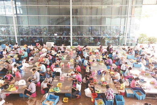 龙州县结合边境区位优势,大力发展坚果贸易加工产业,引导群众入园就业增加收入。图为群众正在进行坚果加工。