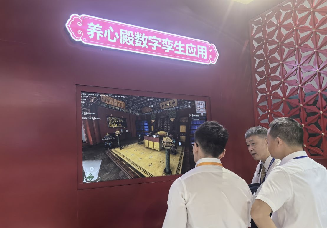 走进2号馆文化旅游遗产馆,故宫博物院展台无疑是“人气担当”。展台前,观众手持手柄就能“走进”养心殿——春天看殿外桃花绽放、夏天赏檐下绿荫蔽日、秋天观庭院落叶飘零、冬天览红墙白雪相映,四季风光在指尖神奇切换,沉浸式体验让不少观众直呼“仿佛穿越时空”。