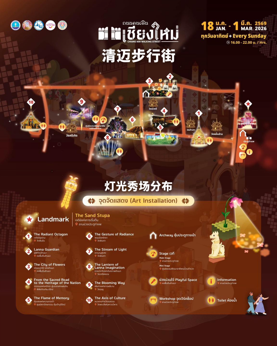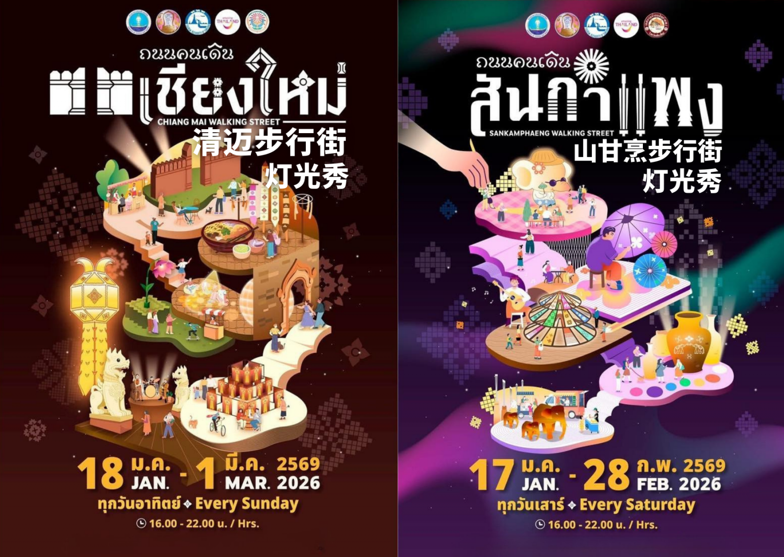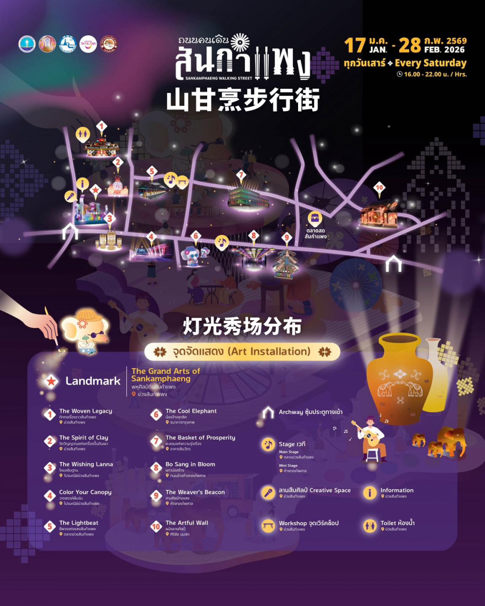 1月17日至3月1日,清迈两大核心步行街 ——塔佩门步行街(Tha Pae Gate Walking Street)和山甘烹步行街(Sankamphaeng Walking Street)将化身夜生活的欢乐据点火力全开,灯光秀、美食摊、手作工坊扎堆上线,一场融合传统与现代的夜游盛宴,即将点燃清迈的夜晚!