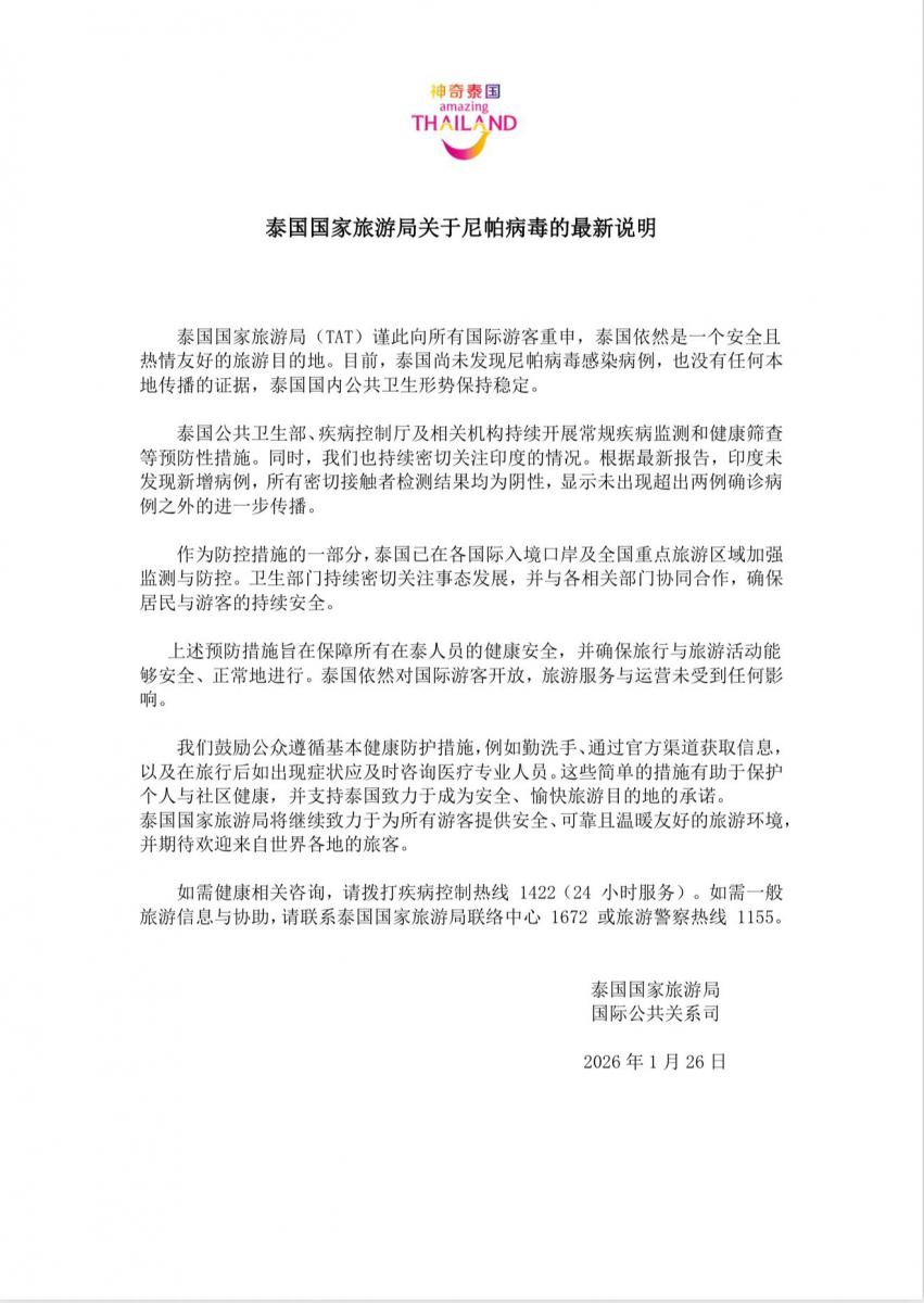 泰国国家旅游局(TAT)谨此向所有国际游客重申,泰国依然是一个安全且热情友好的旅游目的地。目前,泰国尚未发现尼帕病毒感染病例,也没有任何本地传播的证据,泰国国内公共卫生形势保持稳定。
