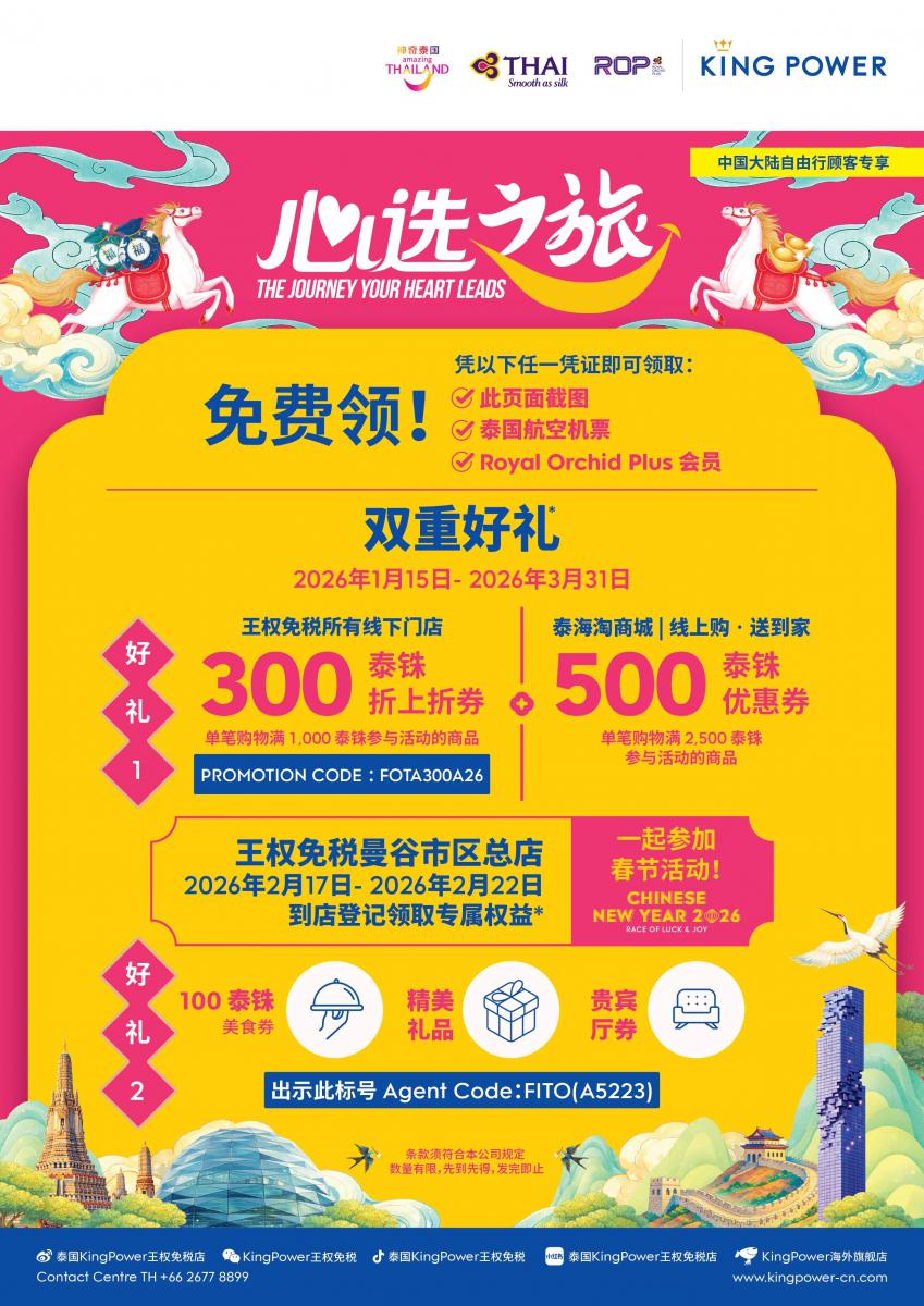 KING POWER王权免税店携手泰国国家旅游局、泰国航空、皇家风兰常客计划Royal Orchid Plus,为您打造专属春节旅行体验。