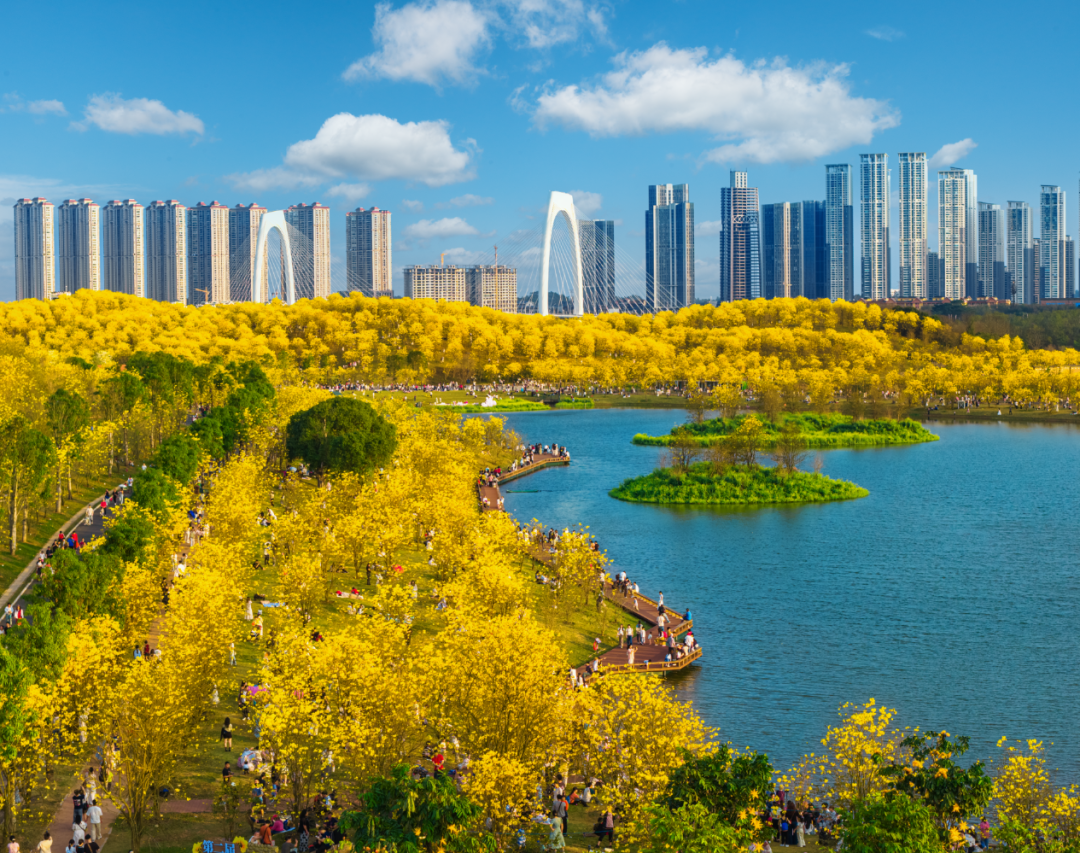 青秀山风景区:这里是春天的调色盘。黄花风铃木正值最佳观赏期,满树金黄,如串串风铃在风中摇曳 。桃花岛的桃花争奇斗艳,而丘石花园的郁金香、大花飞燕草也在肆意绽放 。