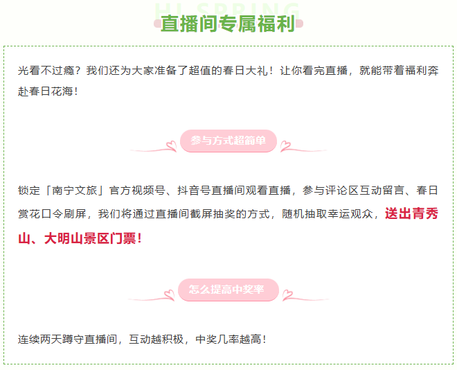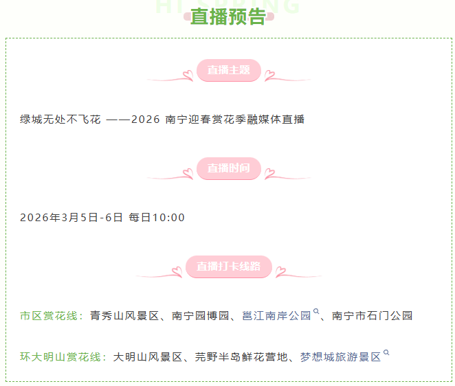 当春风拂过邕江两岸,绿城南宁便被万千繁花拥入怀中。从市区公园的似锦繁英,到环大明山沿线的山野烂漫,目之所及,皆是春日限定的温柔与盛大。为了把这份独属于南宁的春日美好悉数送达,「绿城无处不飞花 ——2026 南宁迎春赏花季融媒体直播」正式官宣!我们将用两天沉浸式慢直播,带你走遍南宁市区与环大明山沿线的宝藏赏花地,足不出户,也能尽收满城飞花盛景。更有海量景区门票福利直播间免费派送,边赏春景边赢好礼,春日惊喜直接拉满!